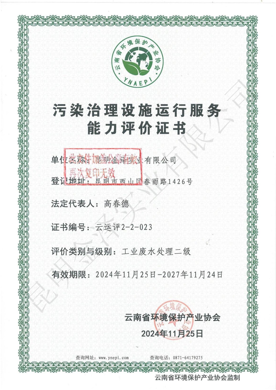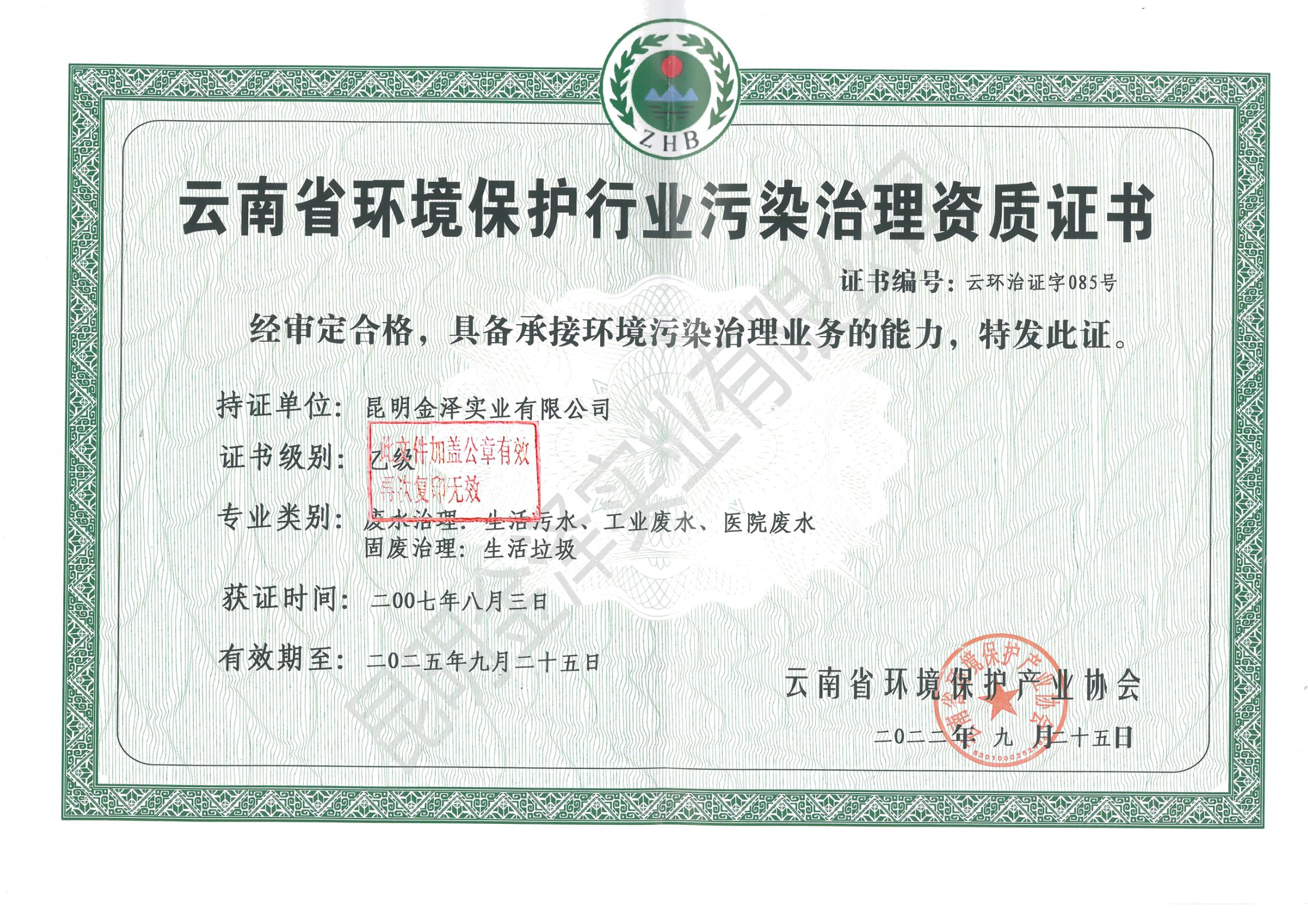 云南省環(huán)境保護產(chǎn)業(yè)協(xié)會會員證書