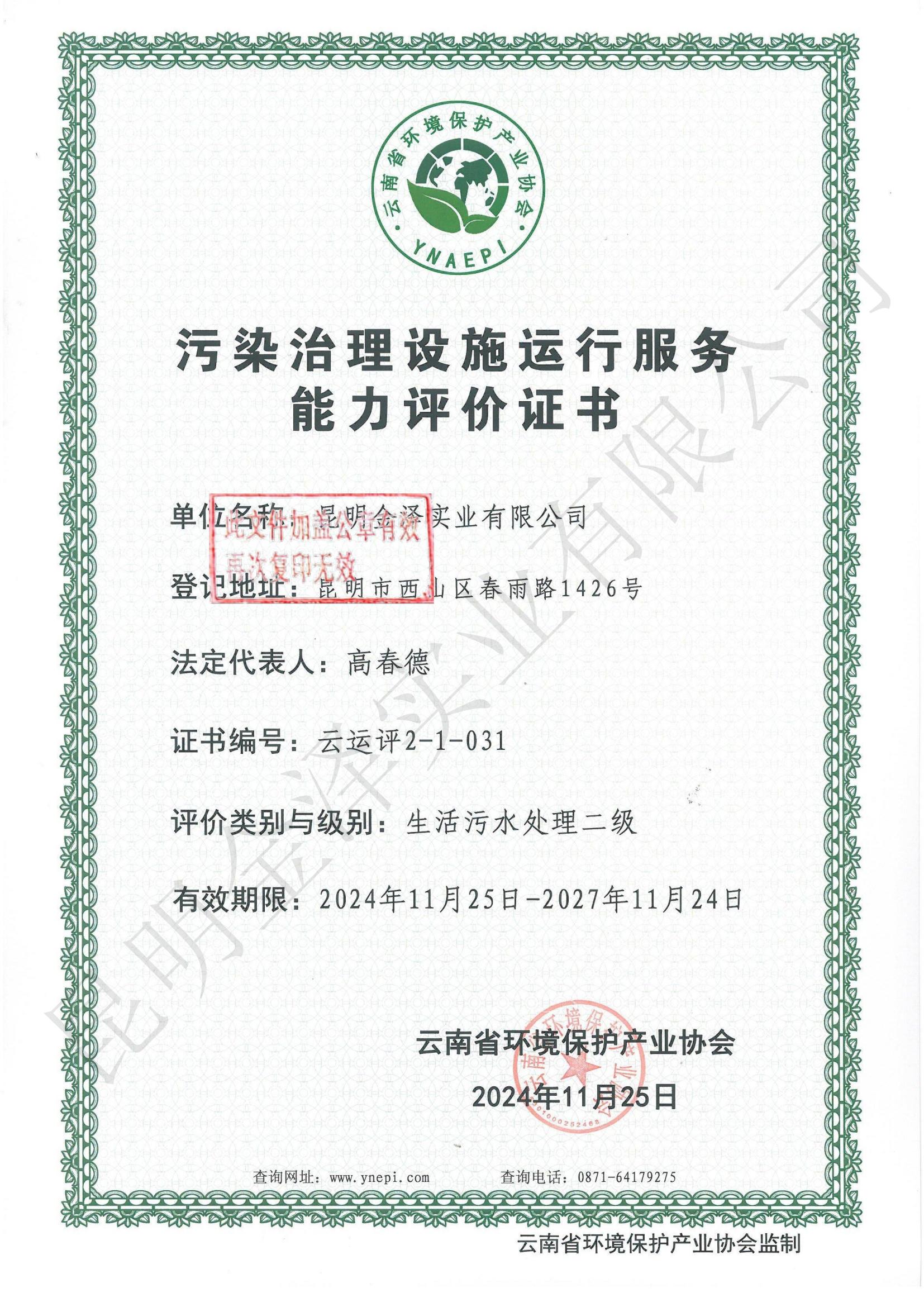 二級生活污水處理運行服務資質(zhì)證書